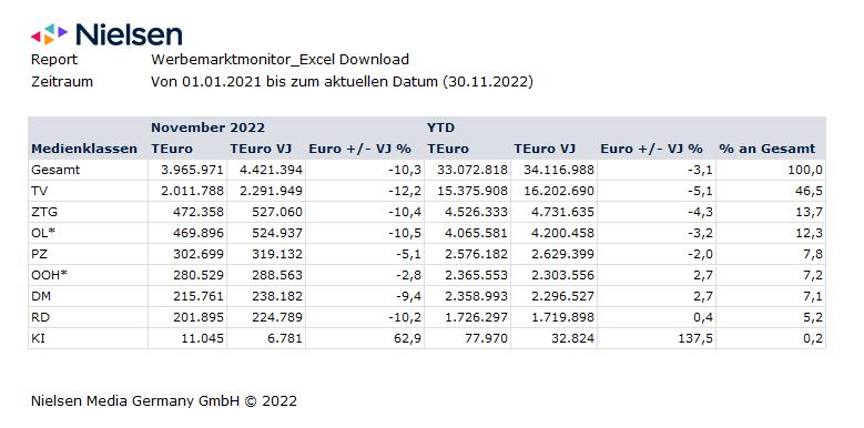 Der deutsche Werbemarkt kann auch im November 2022 das Vorjahresniveau insgesamt nicht erreichen (-10,3%). Mit Bruttowerbespendings von 3,97 Mrd. Euro erzielt der aktuelle Monat jedoch mehr Werbevolumen als noch der Vormonat. Auch im November verzeichnen alle Mediengruppe Verluste.